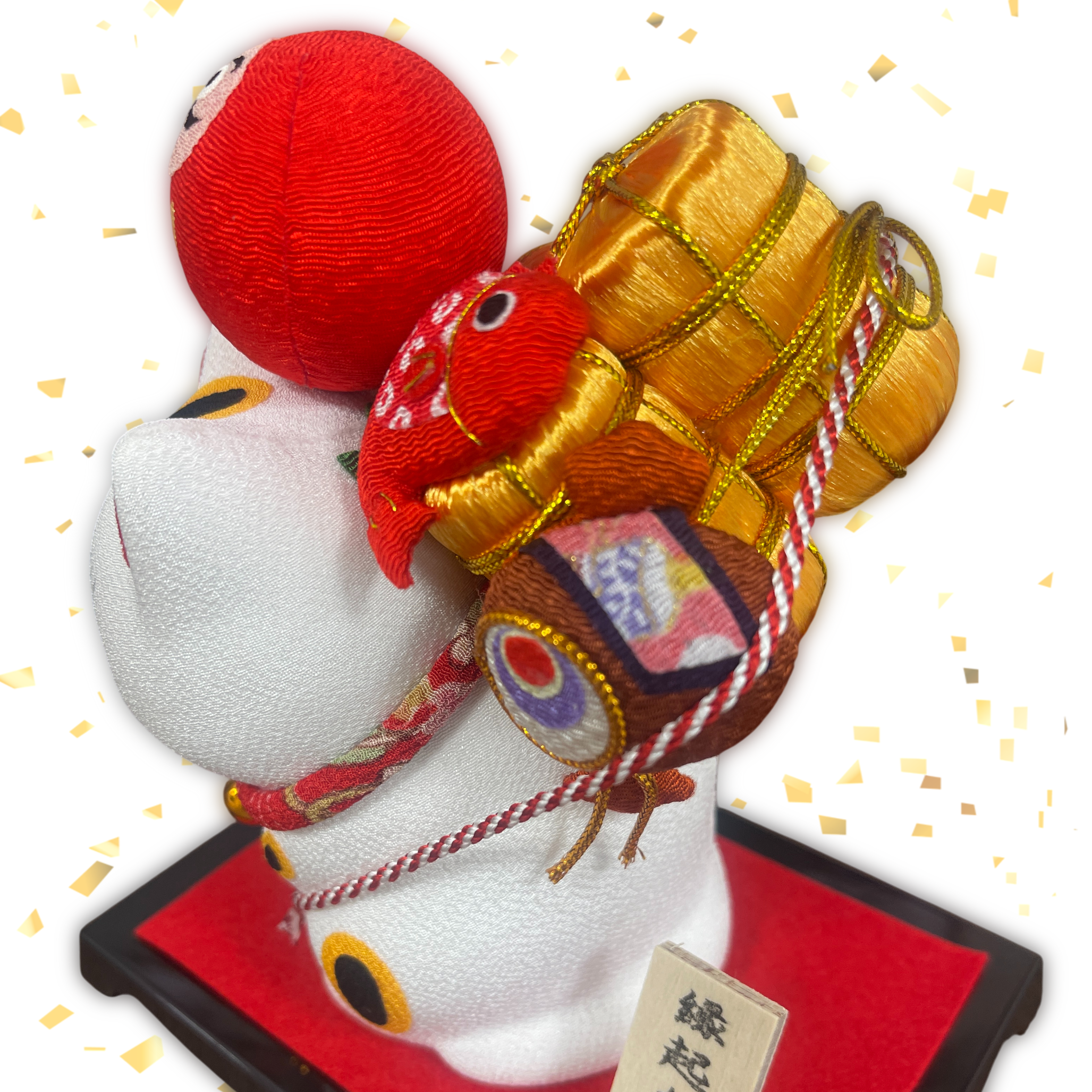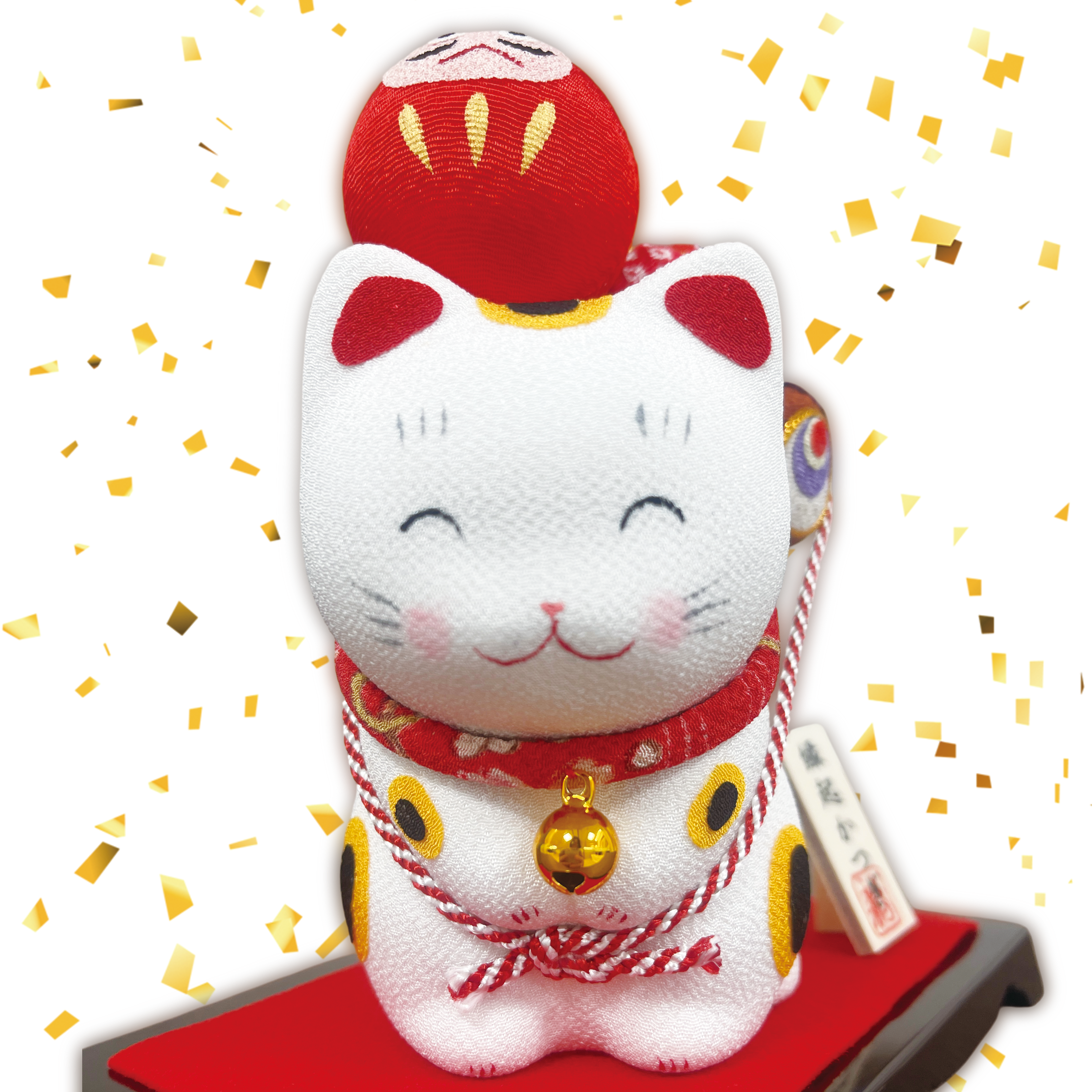 ちりめんの手作ならではの温みが感じられる猫の置物です。だるまや鯛、打ち出の小槌など縁起物をたくさん背負った可愛い猫の置物です。