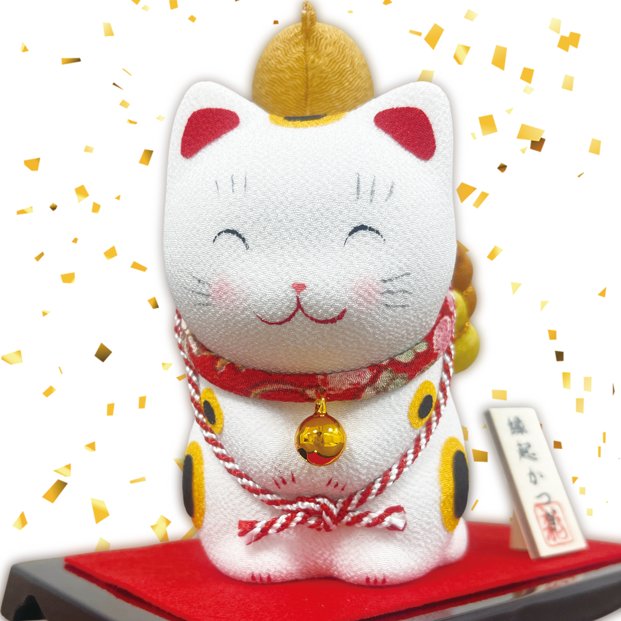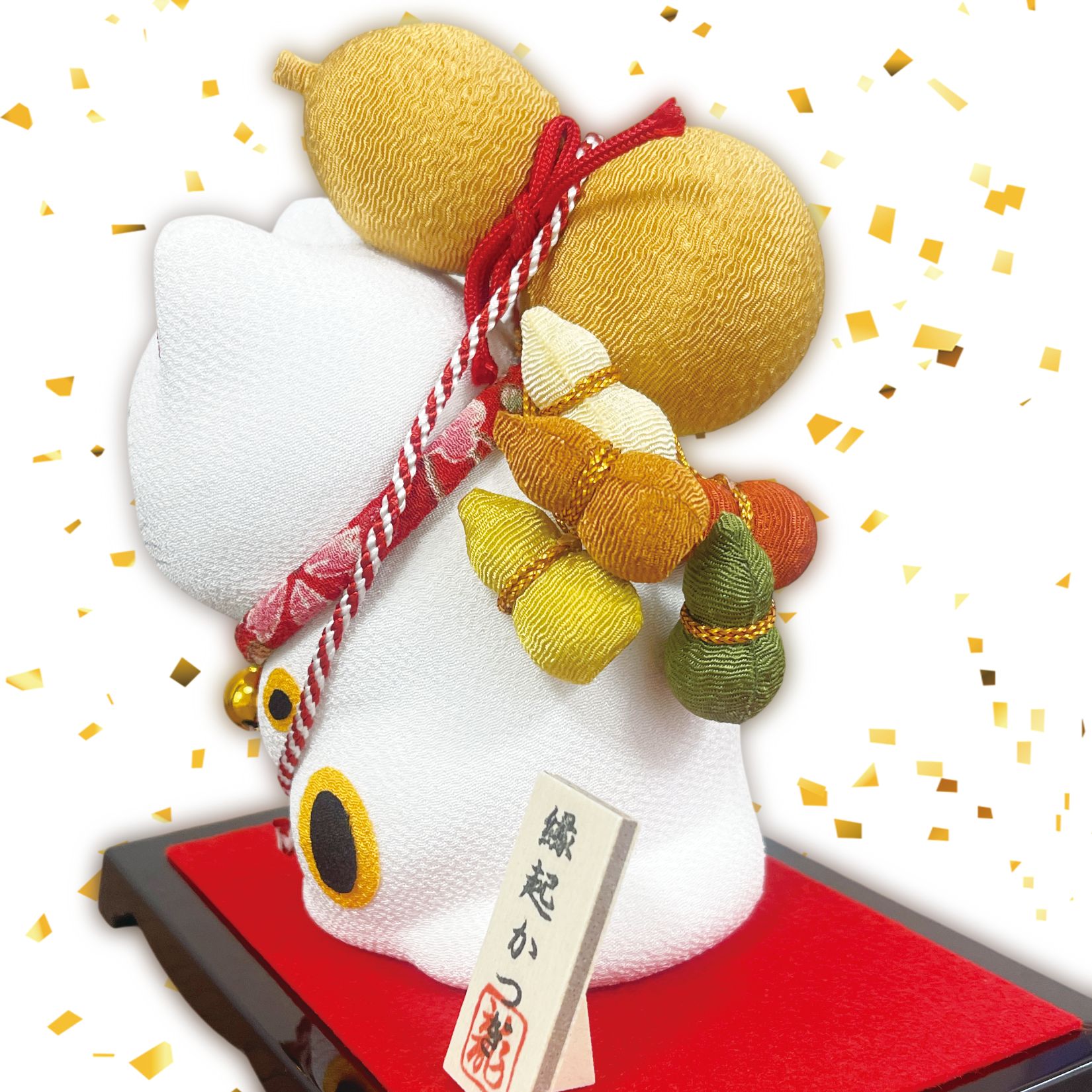 ちりめんの手作ならではの温みが感じられる猫の置物です。だるまや鯛、打ち出の小槌など縁起物をたくさん背負った可愛い猫の置物です。