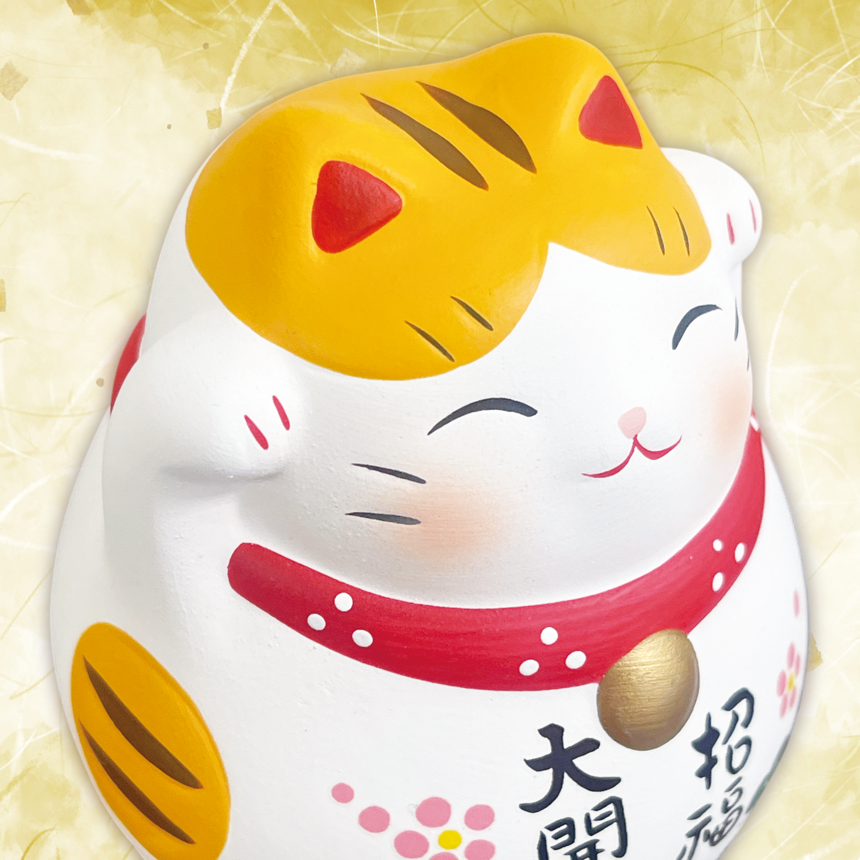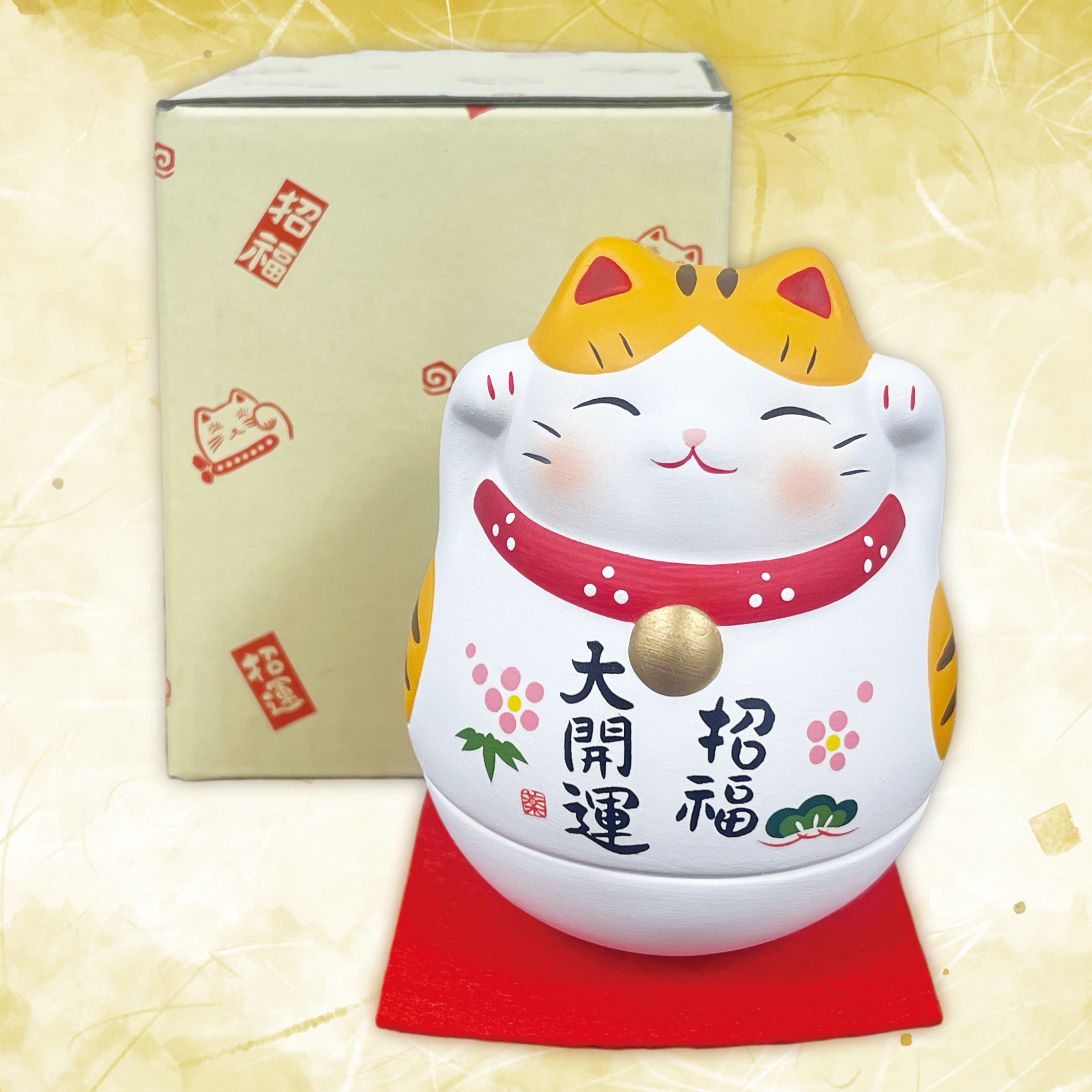 転んでも転んでもコロンと起き上がりる、丸いフォルムが可愛い招き猫です。右手はお金を、左手は人を招きます。両手はお金も人も招きます。開運招福を楽しく演出!記念日の贈り物にも最適です♪